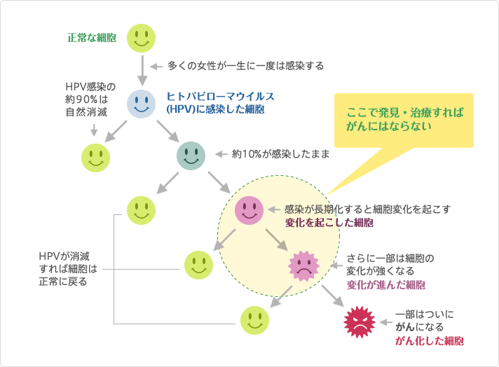 高リスク型のHPVが持続感染している場合でも子宮頸がんになるまでは、通常、数年~十数年と長い時間がかかるので、定期的に子宮頸がん検診を受けていれば、がんになる前の状態(前がん病変)で発見でき、治療することが可能です。